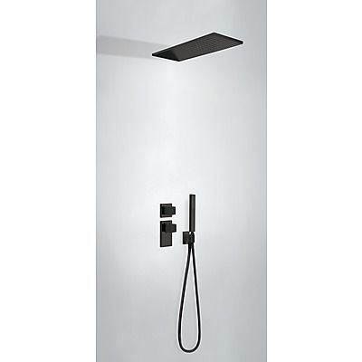 Комплектація: вбудований змішувач з термостатом, розпилювач душовий INOX 210х550 мм, ручний душ з антивапняним покриттям, шланг SATIN1,5 м. - чорне матове покриття, механізм проти скручування