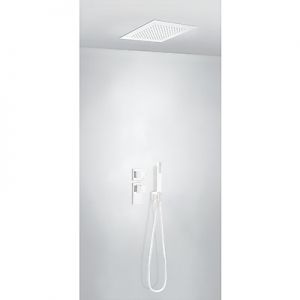 Комплектація: вбудований змішувач з термостатом, розпилювач душовий INOX 380х380 мм, ручний душ з антивапняним покриттям, шланг 1,5 м. - білий хром, механізм проти скручування