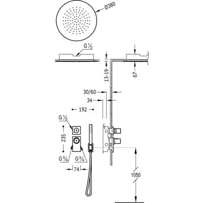Вбудований змішувач з термостатом на 2 джерела (верхній душ + ручний душ)