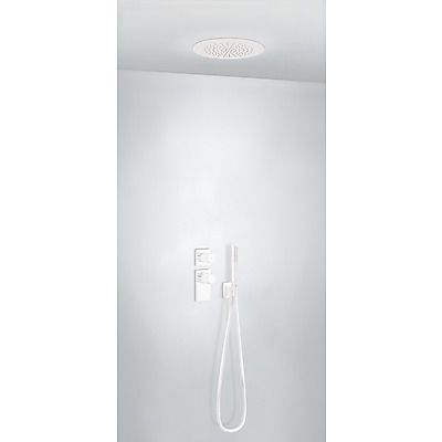 Комплектація: вбудований змішувач з термостатом, верхній стельовий душ D380 мм, ручний душ з антивапняним покриттям, шланг SATIN1,5 м. - біле матове покриття, механізм проти скручування