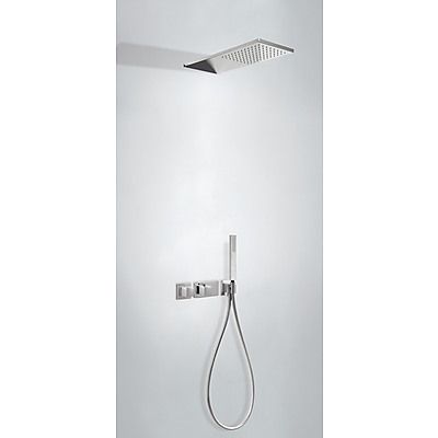 Комплектація: вбудований змішувач з термостатом, розпилювач душовий INOX 210х550 мм, ручний душ з антивапняним покриттям, шланг SATIN1,5 м. - хромове покриття, механізм проти скручування