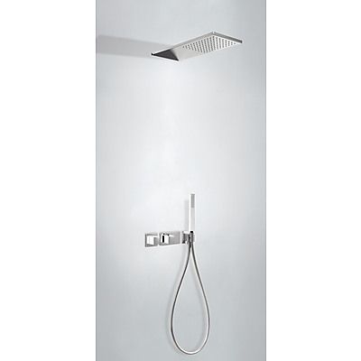 Комплектація: вбудований змішувач з термостатом, розпилювач душовий INOX 210х550 мм, ручний душ з антивапняним покриттям, шланг SATIN1,5 м. - хромове покриття, механізм проти скручування