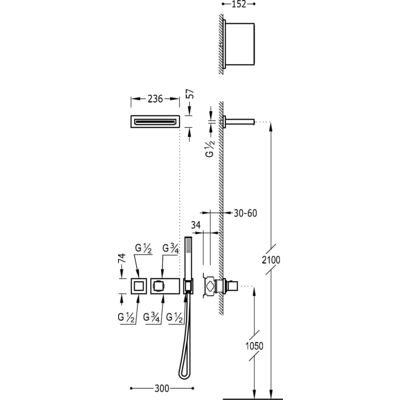 Комплектація: вбудований змішувач з термостатом, каскадний вилив INOX 236х152 мм, ручний душ з антивапняним покриттям, шланг SATIN1,5 м. - хромове покриття, механізм проти скручування