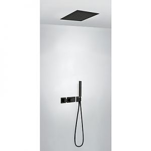 Комплектація: вбудований змішувач з термостатом, розпилювач душовий INOX 380х380 мм, ручний душ з антивапняним покриттям, шланг 1,5 м. - чорне матове покриття, механізм проти скручування