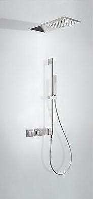 Комплектація: вбудований змішувач з термостатом, розпилювач душовий INOX 210х550 мм, ковзна штанга з настінним водозабором (довжина 760 мм), з ручний душ з антивапняним покриттям, шланг SATIN1,5 м. - хромове покриття, механізм проти скручування