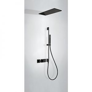 Комплектація: вбудований змішувач з термостатом, розпилювач душовий INOX 210х550 мм, ковзна штанга з настінним водозабором (довжина 760 мм), з ручний душ з антивапняним покриттям, шланг 1,5 м. - чорне матове покриття, механізм проти скручування
