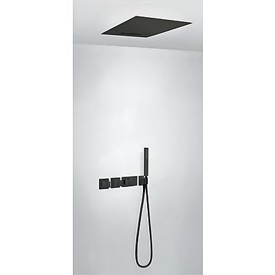 Комплектація: вбудований змішувач з термостатом, розпилювач душовий INOX 500х500 мм 2 режими - тропічний дощ та каскад, ручний душ з антивапняним покриттям, шланг 1,5 м. - чорне матове покриття, механізм проти скручування