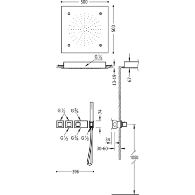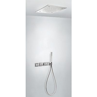 Комплектація: вбудований змішувач з термостатом, розпилювач душовий INOX 500х500 мм 2 режими - тропічний дощ та micro drop, ручний душ з антивапняним покриттям, шланг SATIN1,5 м. - хромове покриття, механізм проти скручування
