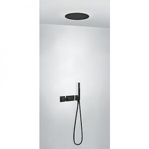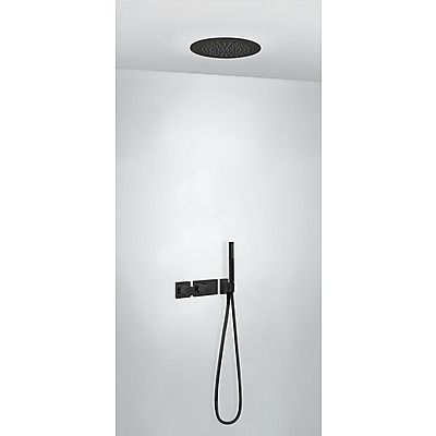 Комплектація: вбудований змішувач з термостатом, розпилювач душовий INOX діаметром 380 мм, ручний душ з антивапняним покриттям, шланг 1,5 м. - чорне матове покриття, механізм проти скручування
