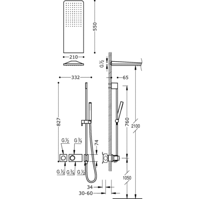 Верхній душ:210х550 мм