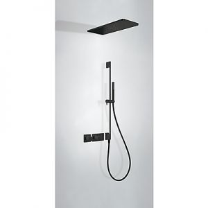 Комплектація: вбудований змішувач з термостатом, розпилювач душовий INOX 210х550 мм, ковзна штанга з настінним водозабором (довжина 760 мм), з ручний душ з антивапняним покриттям, шланг 1,5 м. - чорне матове покриття, механізм проти скручування