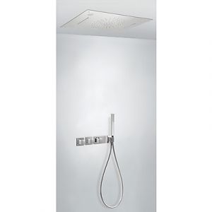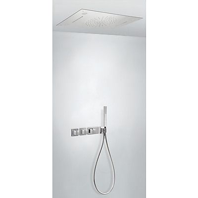 Комплектація: вбудований змішувач з термостатом, розпилювач душовий INOX 800х500 мм 3 режими - тропічний дощ, каскад та хромотерапія, ручний душ з антивапняним покриттям, шланг SATIN1,5 м. - хромове покриття, механізм проти скручування
