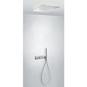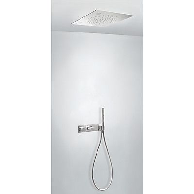 Комплектація: вбудований змішувач з термостатом, розпилювач душовий INOX 500х500 мм, ручний душ з антивапняним покриттям, шланг SATIN1,5 м. - хромове покриття, механізм проти скручування