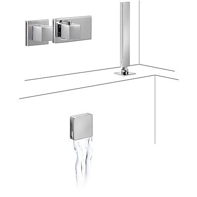 Комплектація: вбудований змішувач з термостатом, ручний душ з антивапняним покриттям, шланг з подвійним обплетенням, злив для ванни та квадратний наповнювач типу КАСКАД з переливом; сифон ПВХ для ванни