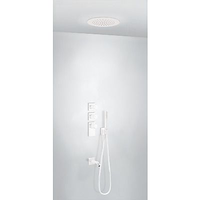 Комплектація: вбудований змішувач з термостатом, розпилювач душовий INOX діаметром 380 мм, каскадний вилив INOX (d24 мм, довжина 153 мм), знімний ручний душ з антивапняним покриттям, шланг SATIN1,5 м. - біле покриття, механізм проти скручування