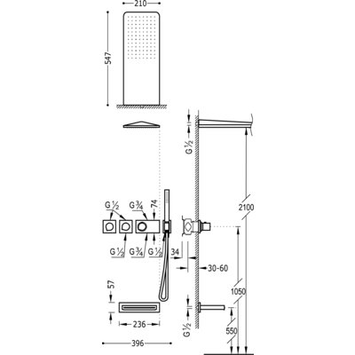 Верхній душ:210х550 мм