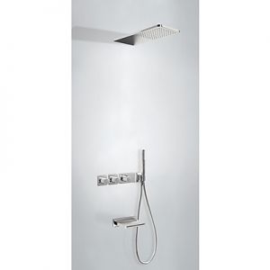Комплектація: вбудований змішувач з термостатом, розпилювач душовий INOX 210х550 мм, каскадний вилив INOX (236х57 мм), знімний ручний душ з антивапняним покриттям, шланг SATIN1,5 м. - хромове покриття, механізм проти скручування