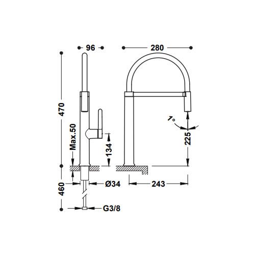 Змішувач для кухні Tres Cocina з гнучким виливом золото 23048701OM з гнучким виливом має наступні характеристики: