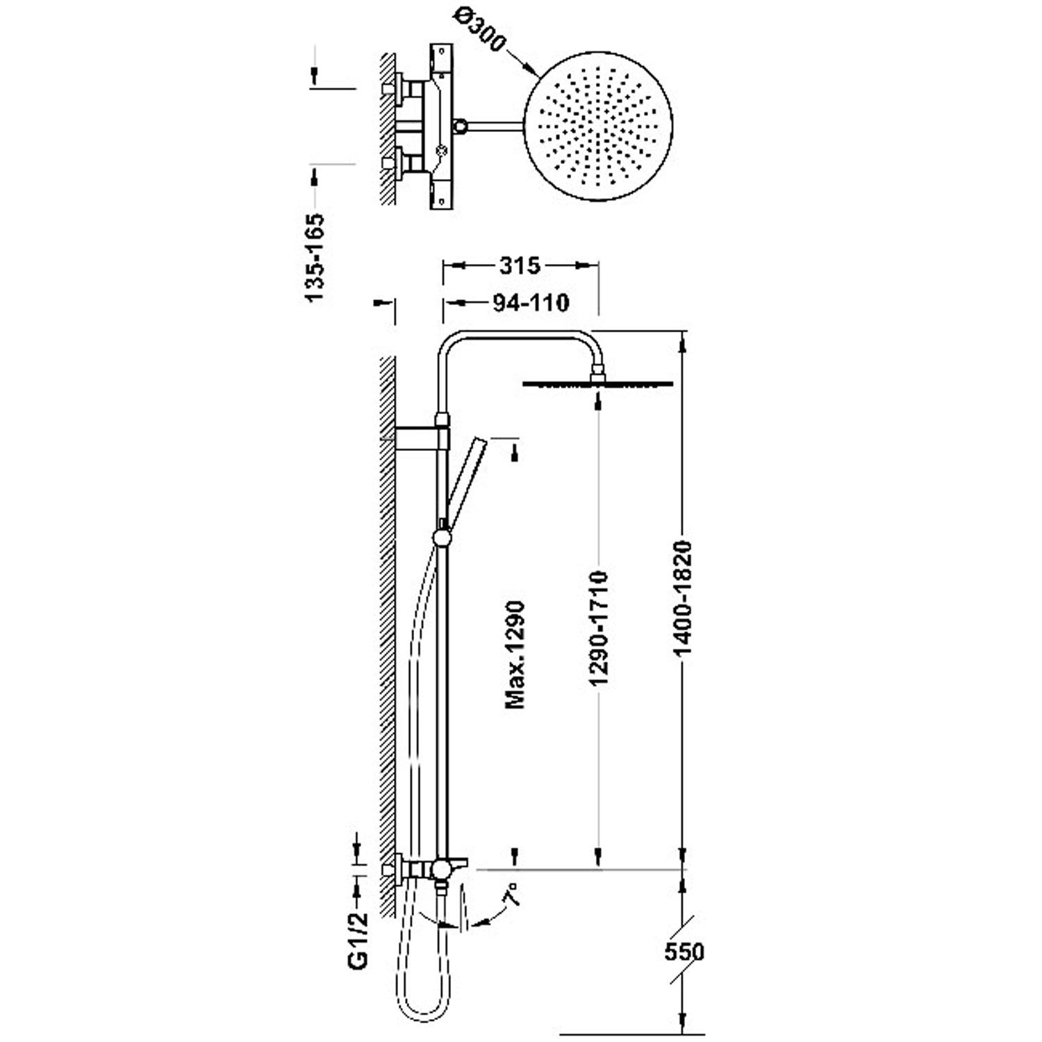 Верхній душ:D300 мм