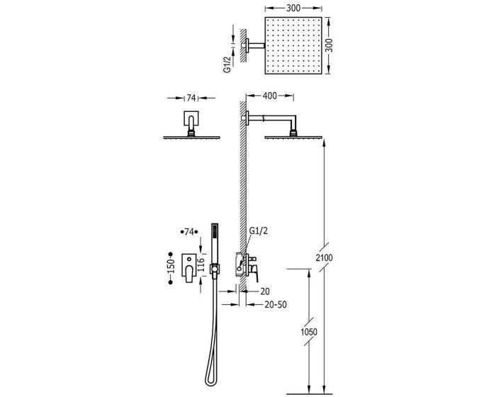 Комплектація:Душ.система: верхній душ ("дощ") + вбудований змішувач + ручний душ з утримувачем
