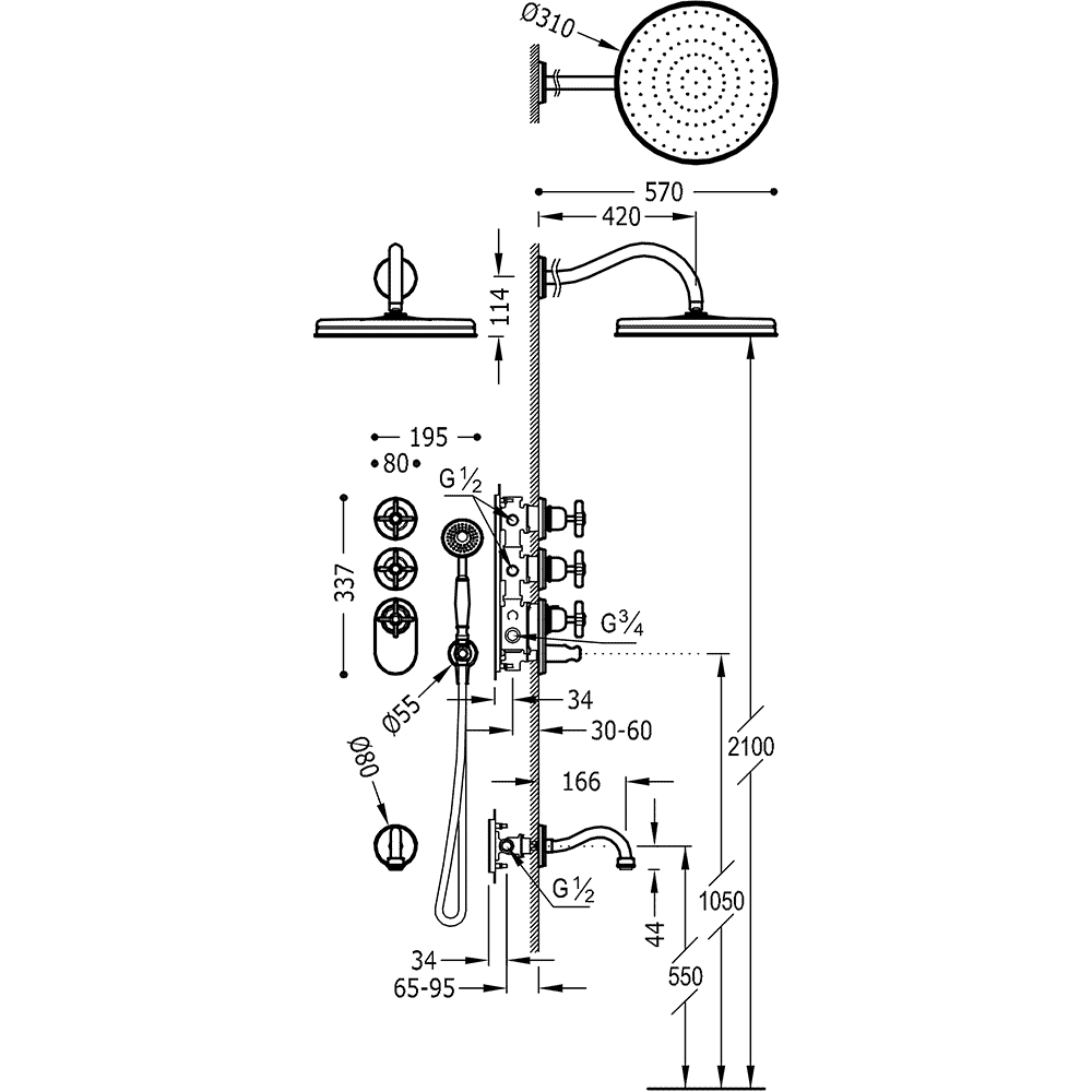 Верхній душ:D310 мм