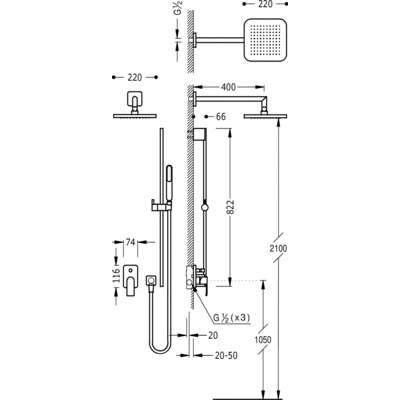 200.180.03 Душова система з одноважільний вбудований змішувач Tres Loft