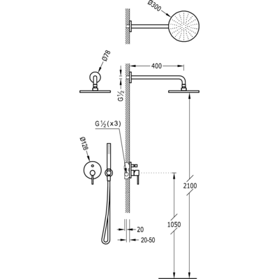 Верхній душ:D300 мм