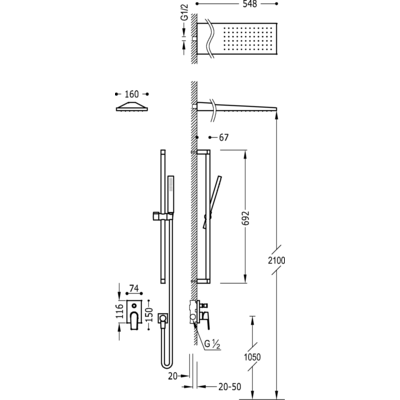 Верхній душ:160х550 мм
