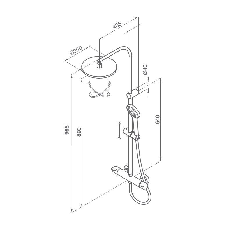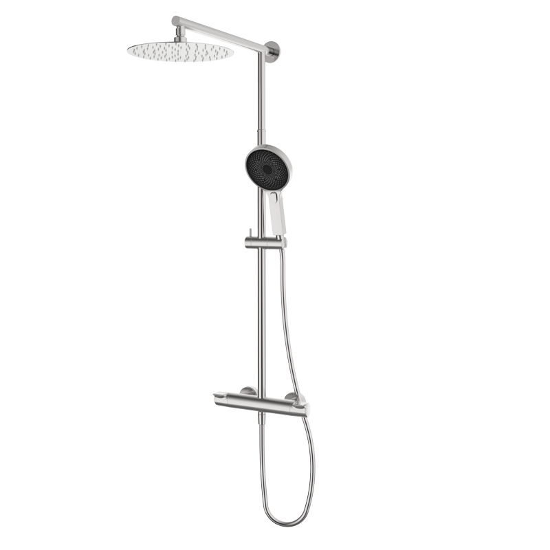 Система має дивертер з лівою ручкою керування потоком, а також регульовану настінну опорну колону, яка дозволяє приховати наявні монтажні отвори в стіні або плитці. Регульована висота колони (785–1270 мм) дає змогу ідеально адаптувати систему під будь-який простір. Передбачена можливість кріплення на стіну за допомогою клею, без свердління.