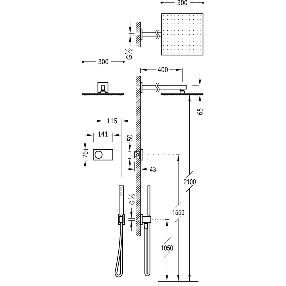 · Незнімний душ 300х300 мм. із шарніром. Латунь.
