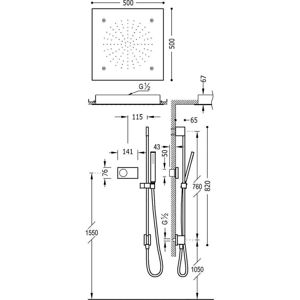 · Розпилювач душовий INOX стельовий з 2 типів струменя 500x500 мм.