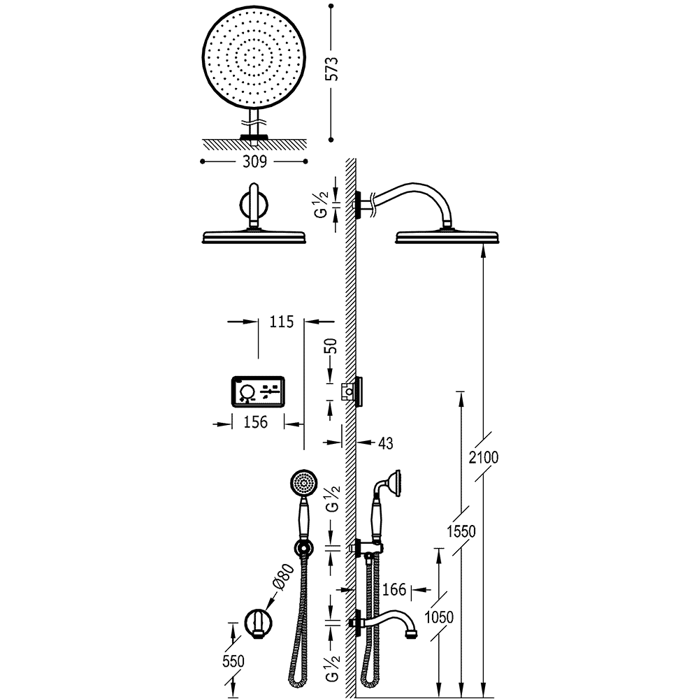 Верхній душ:D310 мм