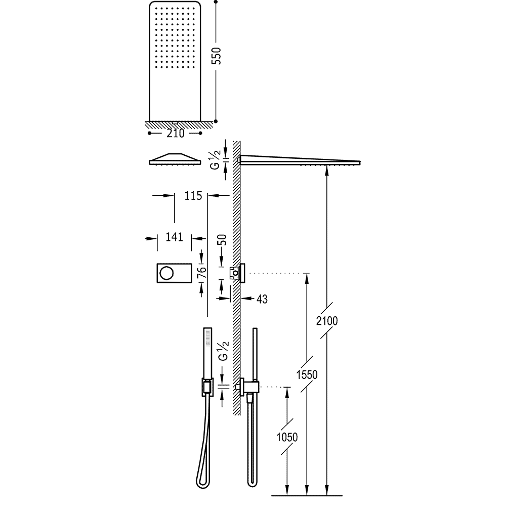 Верхній душ:210х550 мм