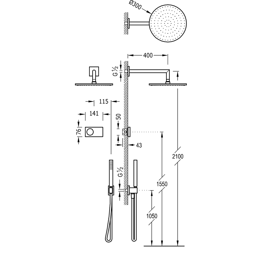 Верхній душ:D300 мм