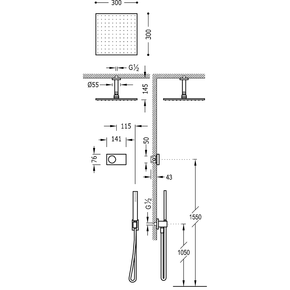 · Незнімний душ 300х300 мм. із шарніром. Латунь.