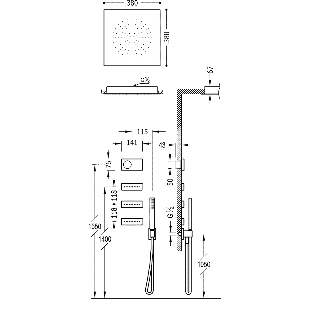 Верхній душ:380х380 мм