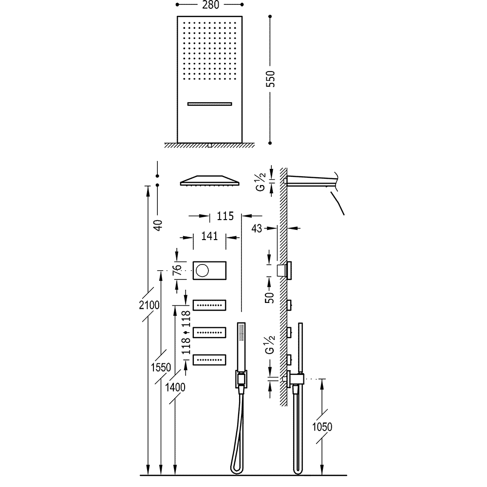 · Розпилювач душовий INOX настінний з 2 типами струменя 280x550 мм.