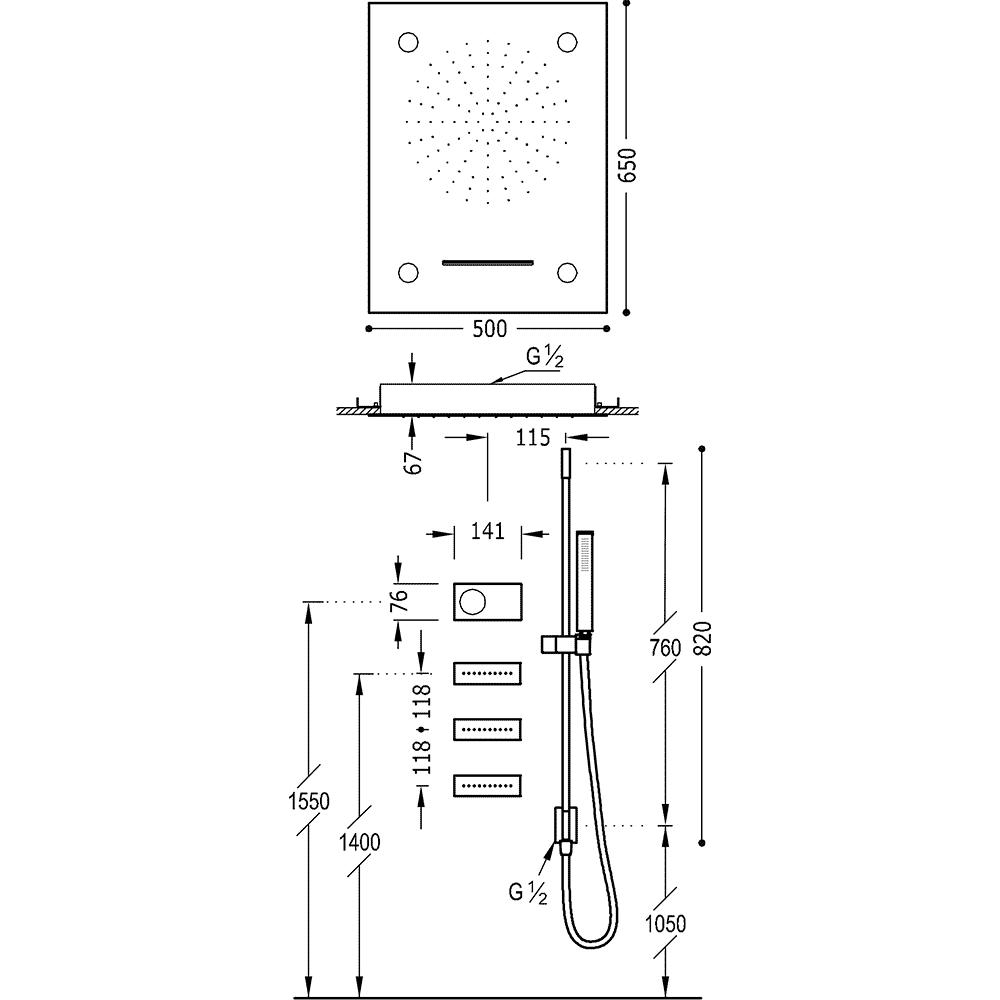 Верхній душ:500х650 мм