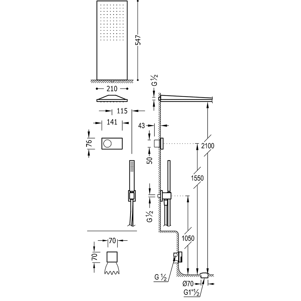 Верхній душ:210х550 мм