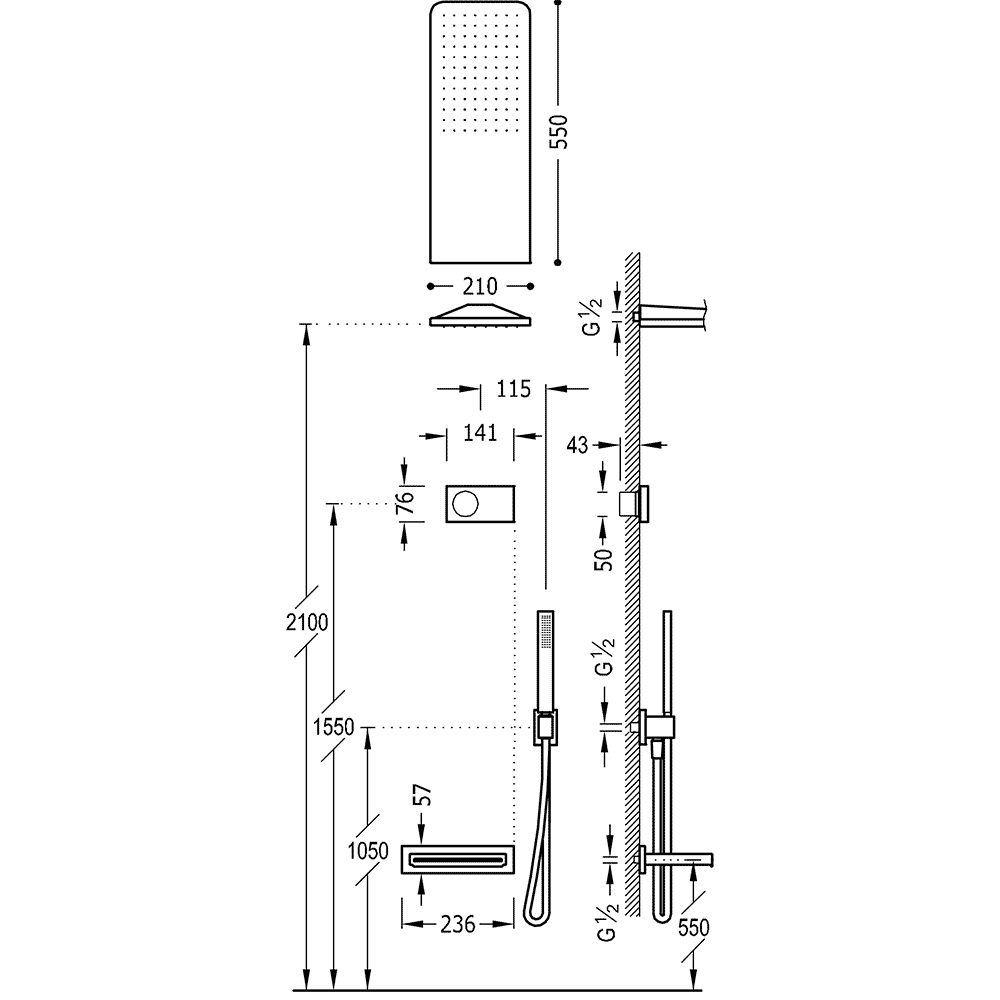 Верхній душ:210х550 мм