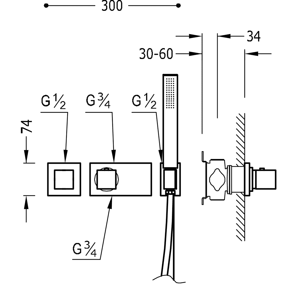 Комплектація: вбудований змішувач з термостатом, ручний душ з антивапняним покриттям, шланг SATIN1,5 м. - хромове покриття, механізм проти скручування