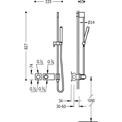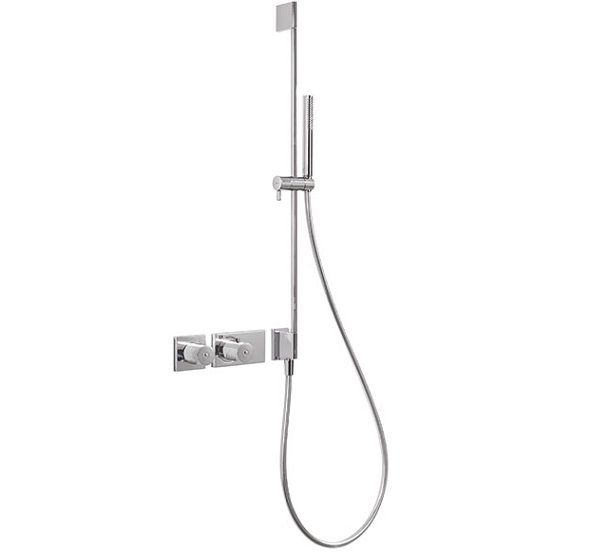 Комплектація: вбудований змішувач з термостатом, ковзна штанга з настінним водозабором (довжина 760 мм), ручний душ з антивапняним покриттям, шланг SATIN1,5 м. - хромове покриття, механізм проти скручування