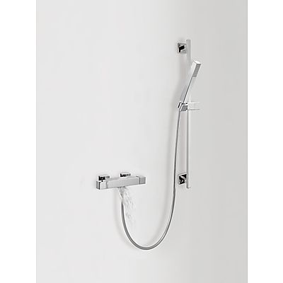 Комплектація: змішувач для ванни з каскадним виливом з термостатом, ручний душ з антивапняним покриттям та регульованим тримачем, шланг SATIN1,7 м. - хромове покриття, механізм проти скручування