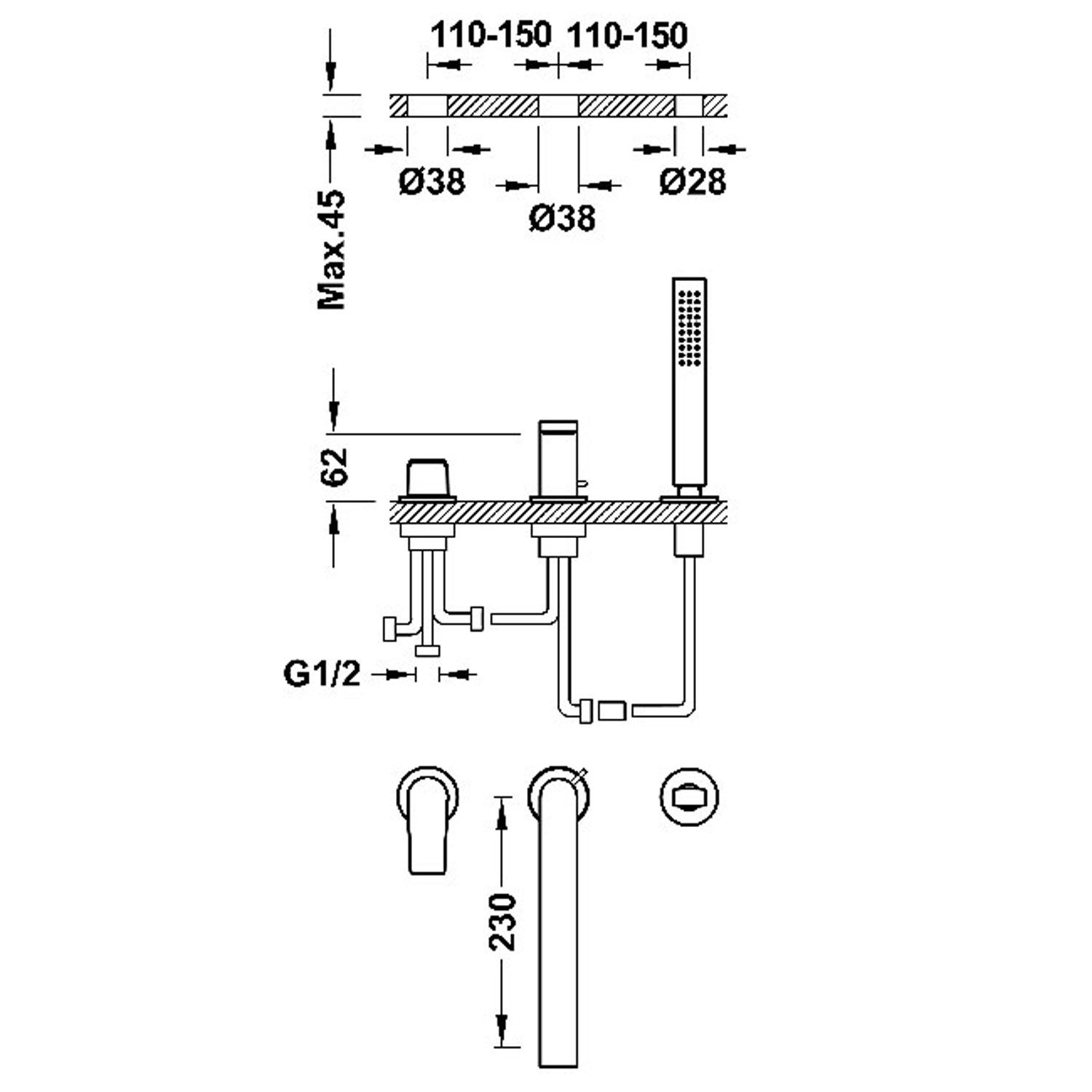 - Одноважільний змішувач для ванни на 3 отвори